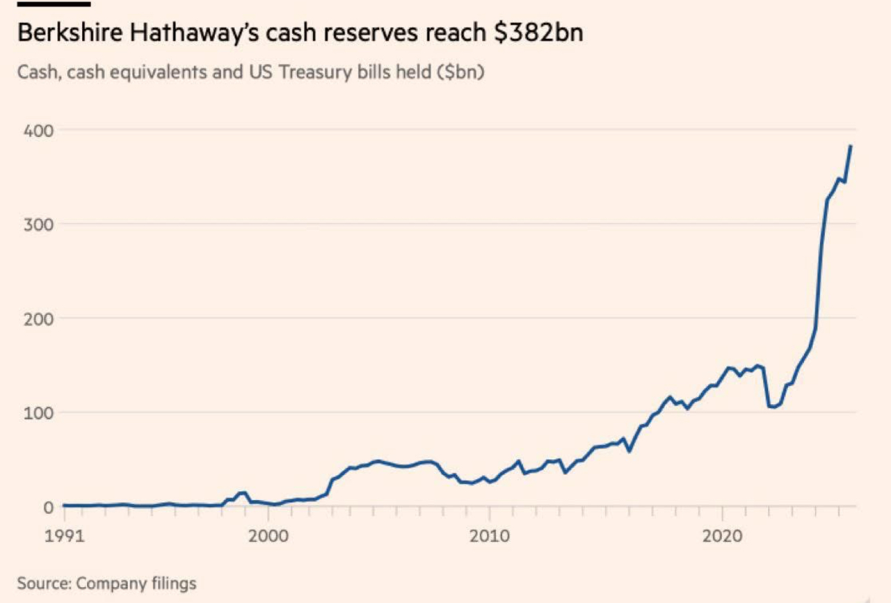 Podľa oficiálnych finančných výkazov za 3. štvrťrok 2025 drží Berkshire Hathaway približne 382 miliárd dolárov v hotovosti a krátkodobých štátnych dlhopisoch (T-bills). Celkový majetok firmy dosahuje približne 1,23 bilióna dolárov.